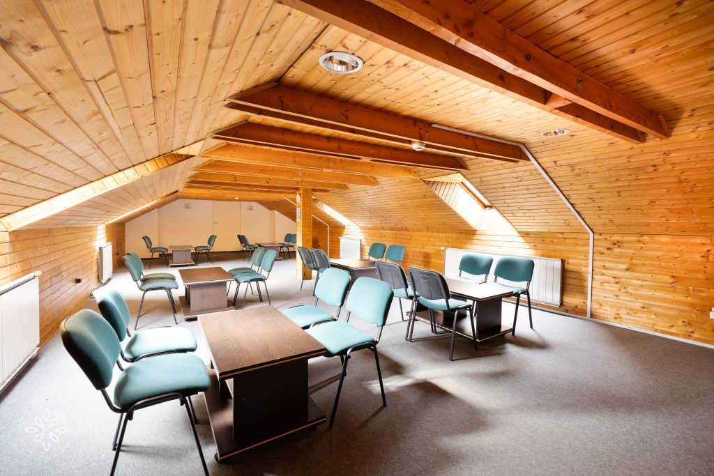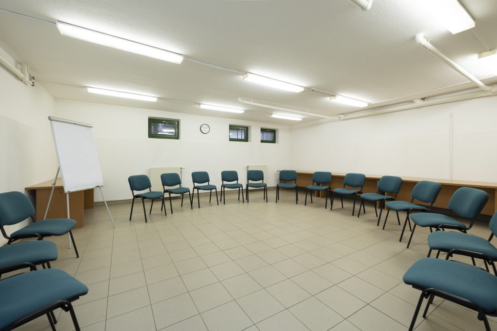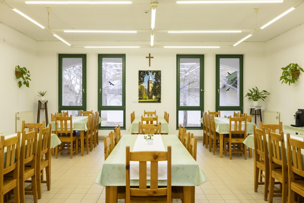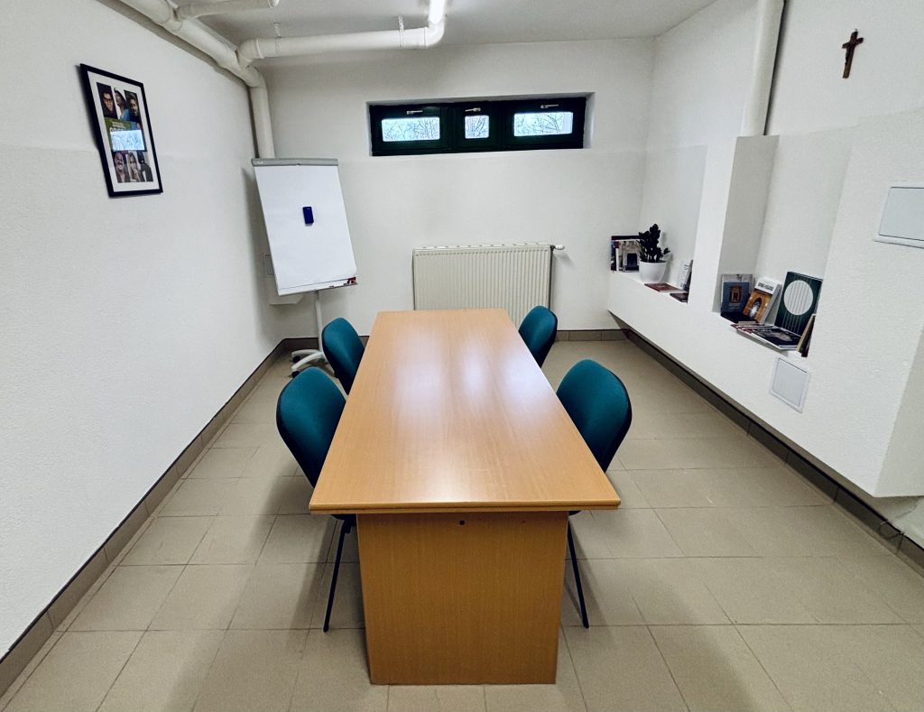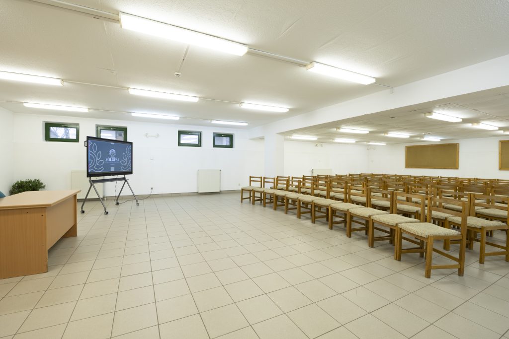 Tájolásának köszönhetően nagyon kellemes, napfényes hangulattal rendelkező termünk 30 fő számára kényelmes helyszínt biztosít egy jó ízű beszélgetéshez, lelki elmélyüléshez, vagy épp egy workshop alkalomhoz.